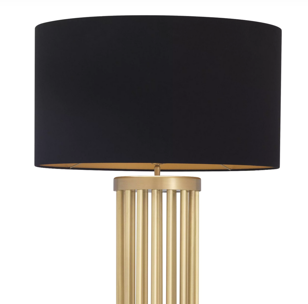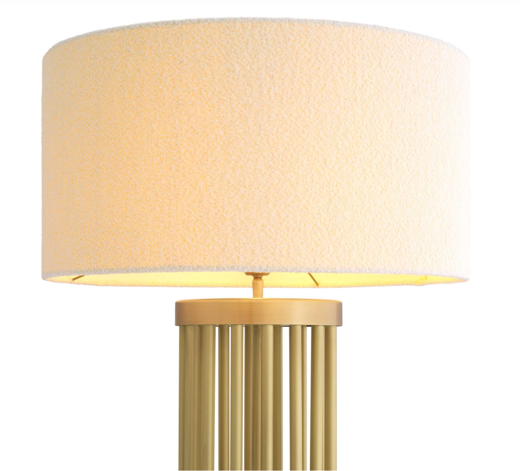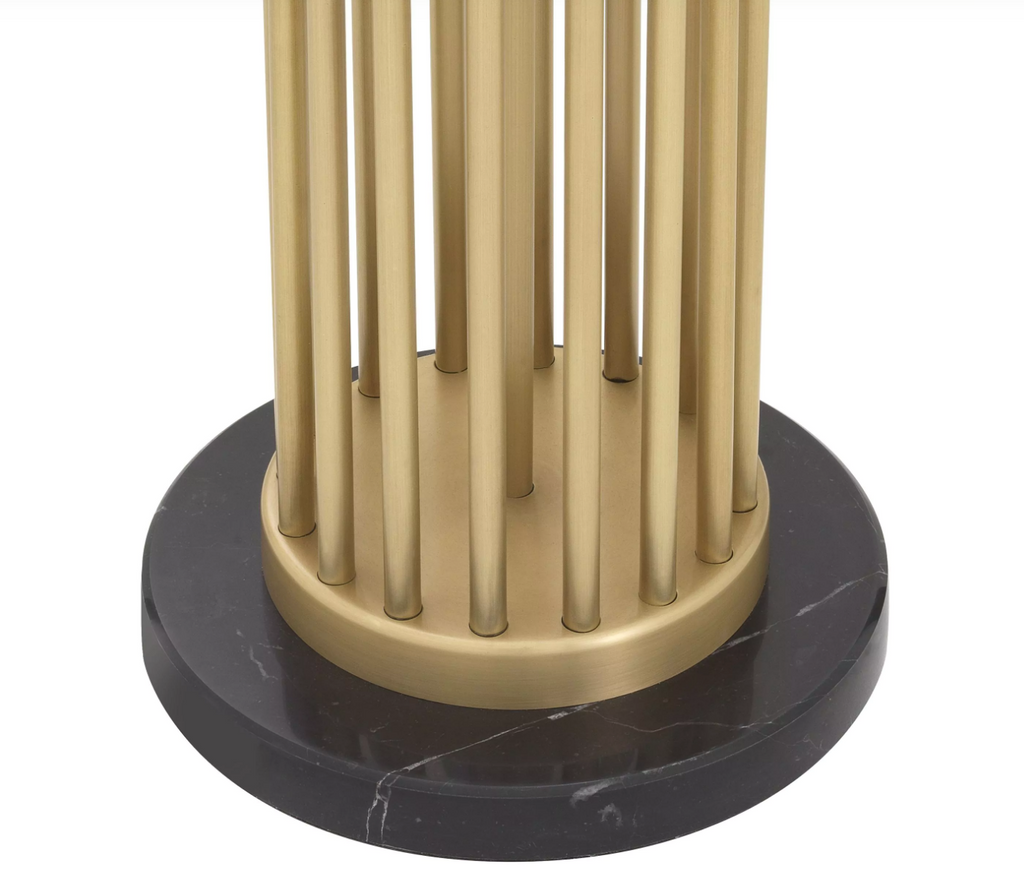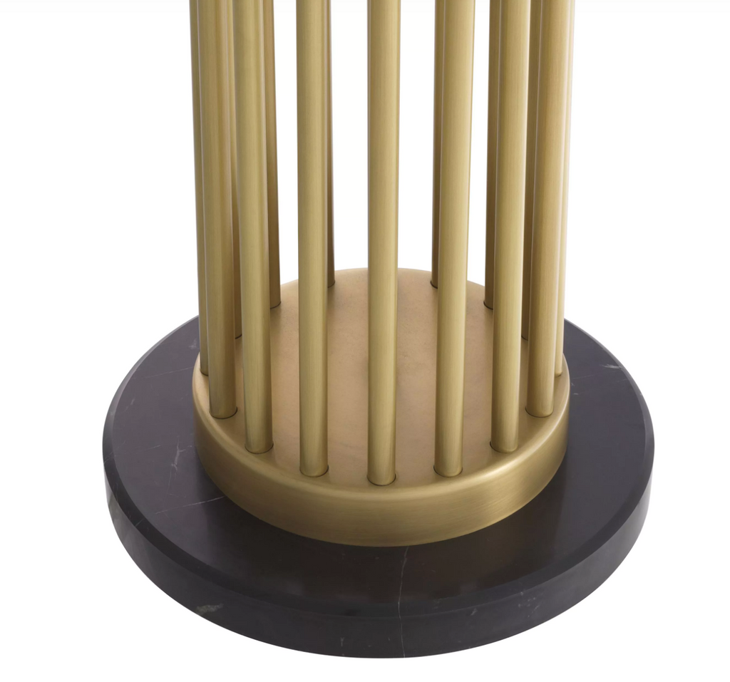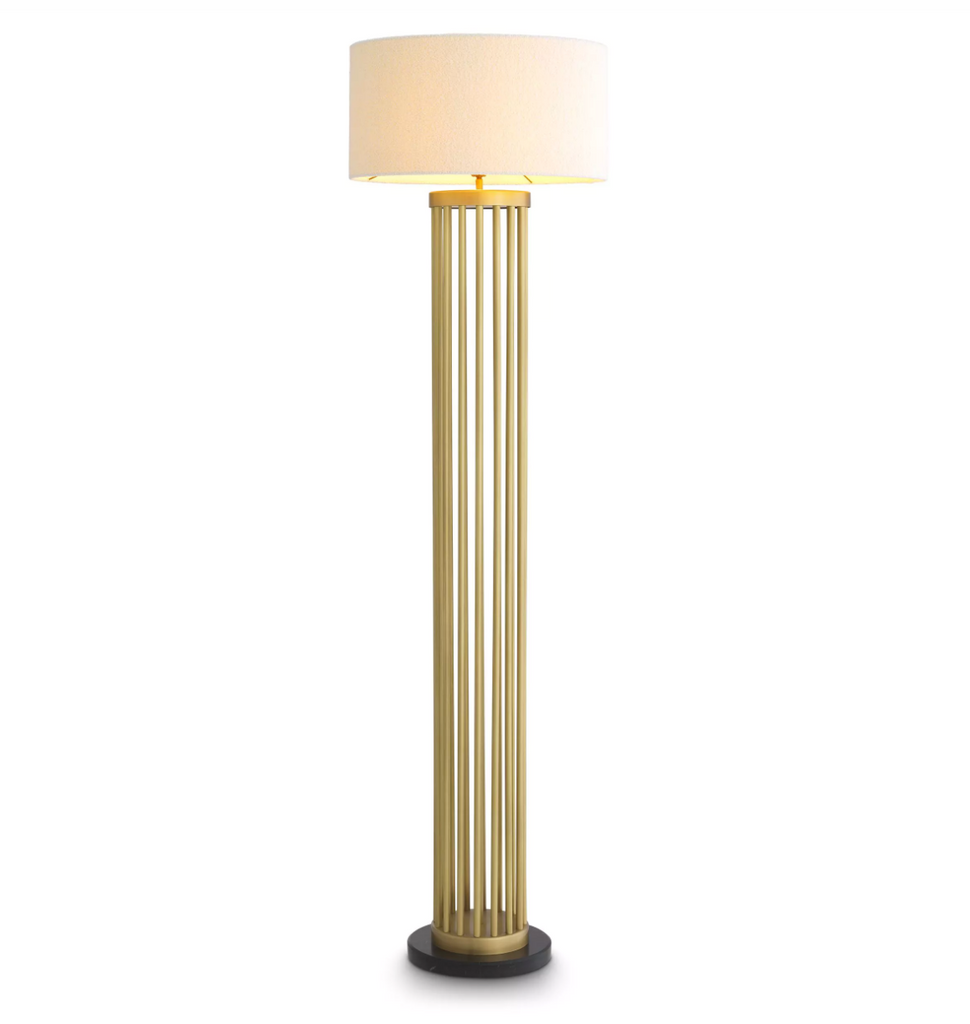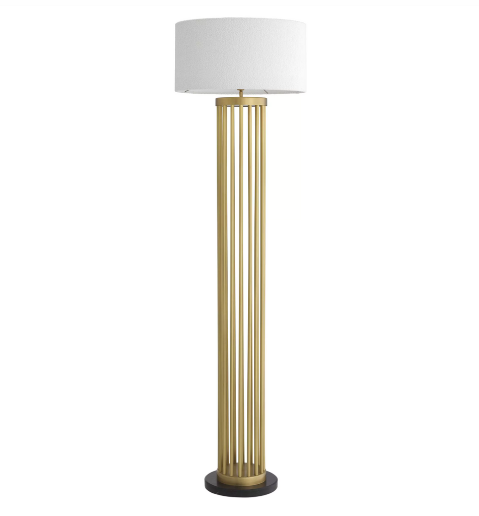 Descrizione: Aggiorna la tua casa con Lampada da terra Condo. Seduta su una base in marmo nero, questa moderna lampada da terra irradia un fascino discreto. La sua ariosa base cilindrica è costituita da aste di metallo con finitura in ottone anticato. L'apparecchio viene fornito completo di un paralume rotondo nero o bianco bouclé con un interno color oro per una luce extra calda.