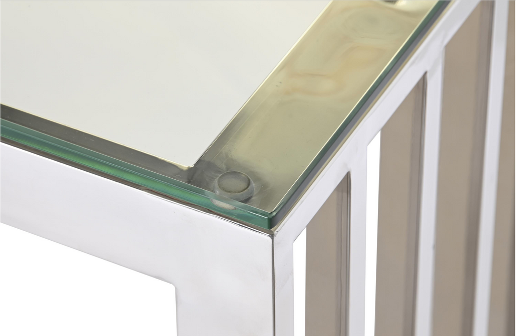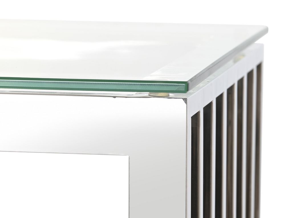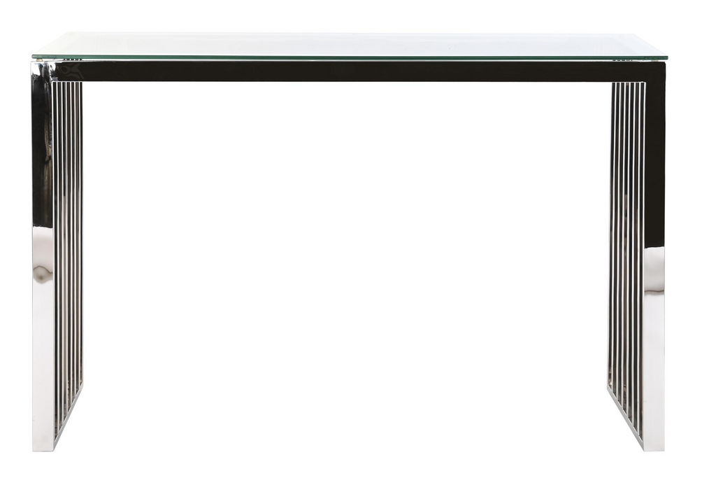 Descrizione: Elegante console in acciaio cromato e cristallo.