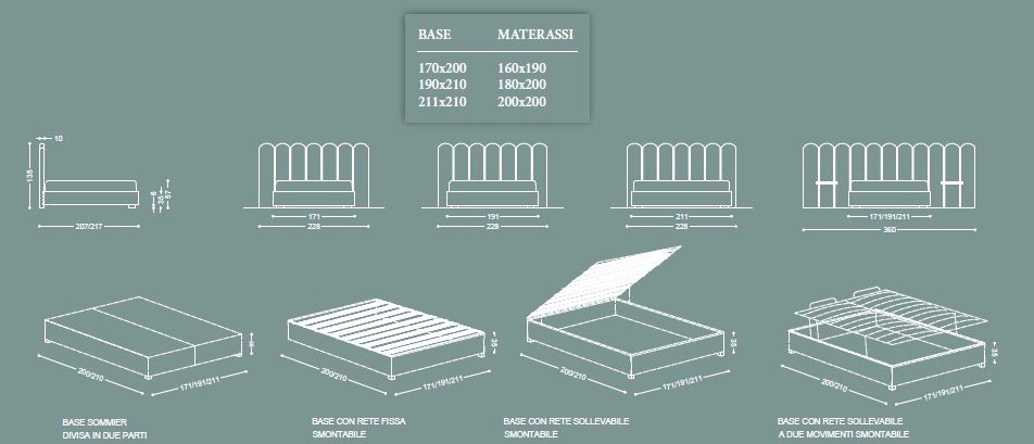 Ciascuna versione è disponibile con base sommier e con rete fissa a doghe in legno oppure base con box e rete sollevabile a doghe in legno o base con rete a 2 movimenti elevabile con box.