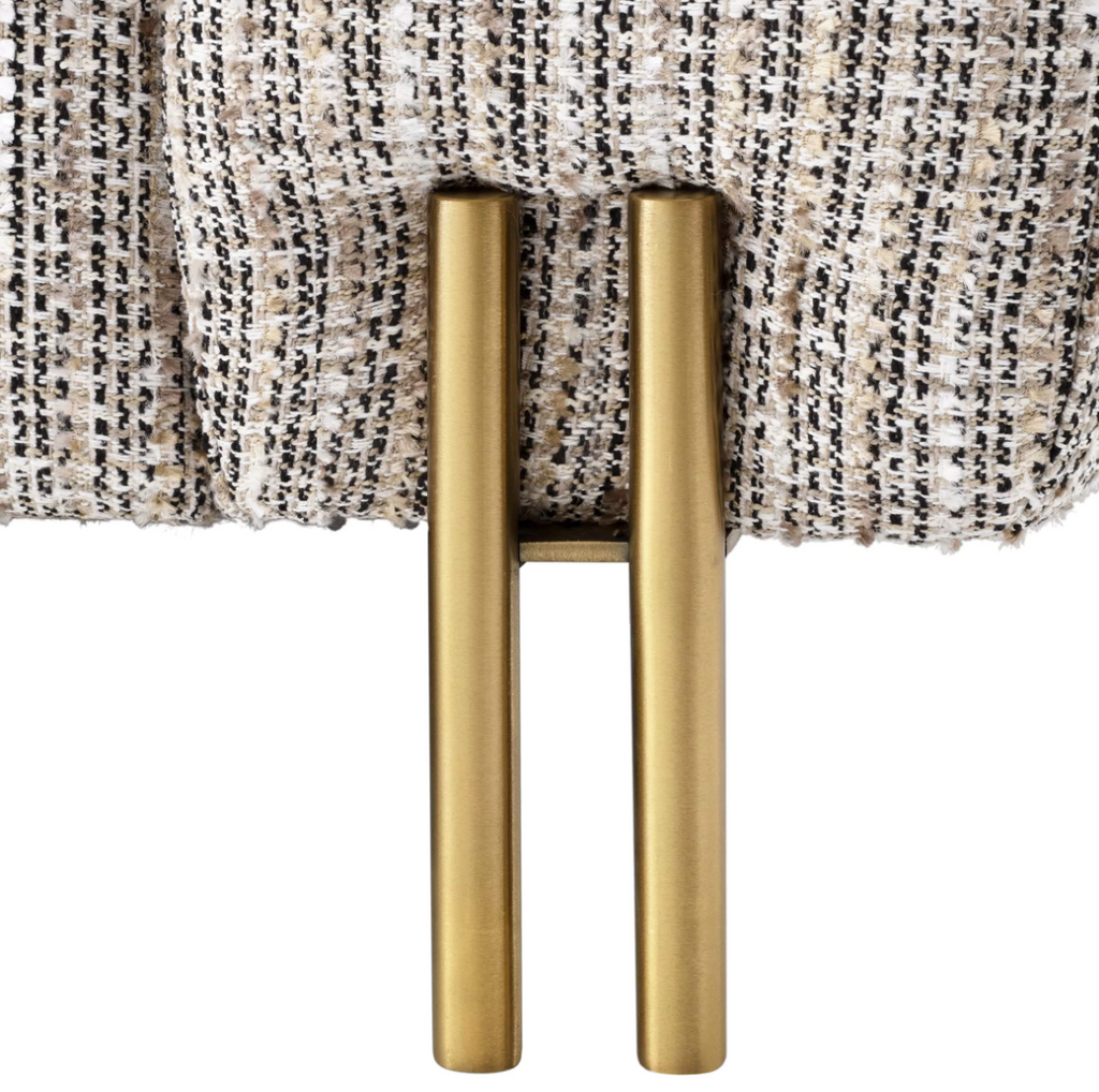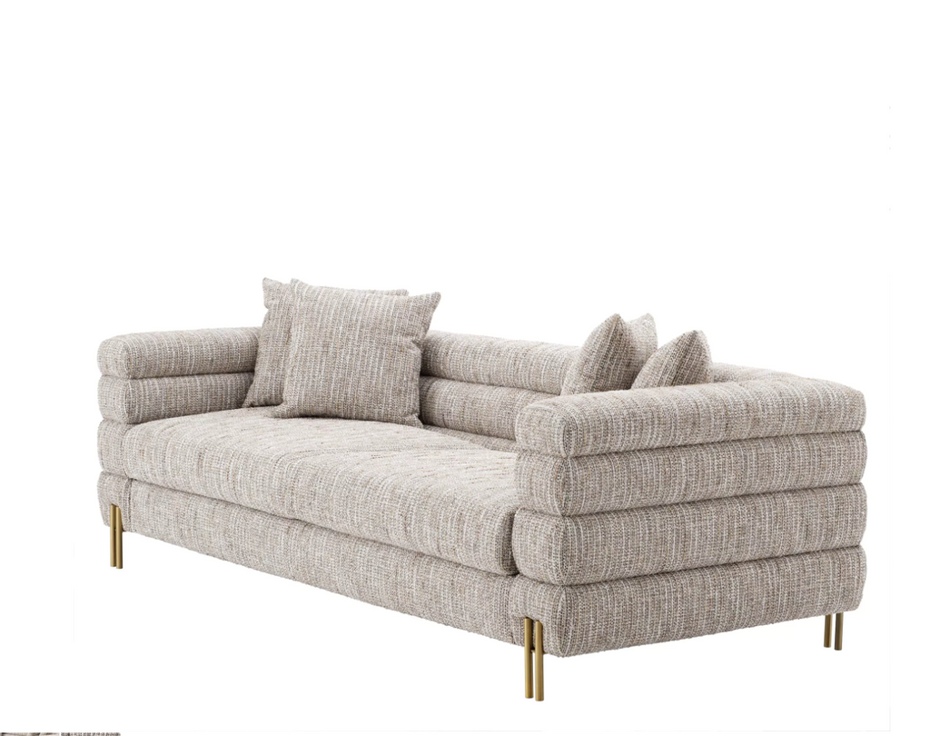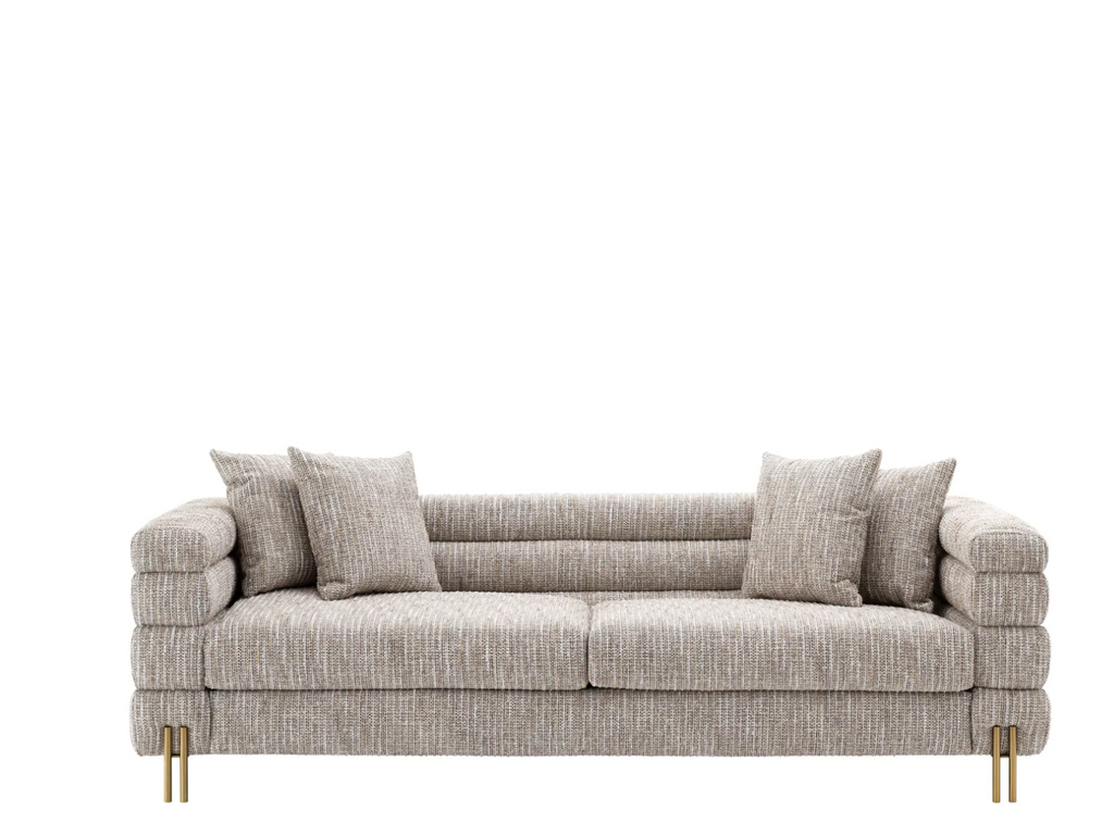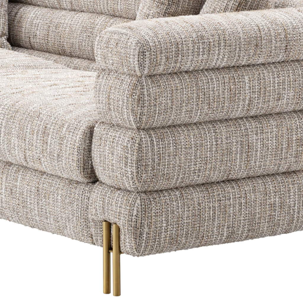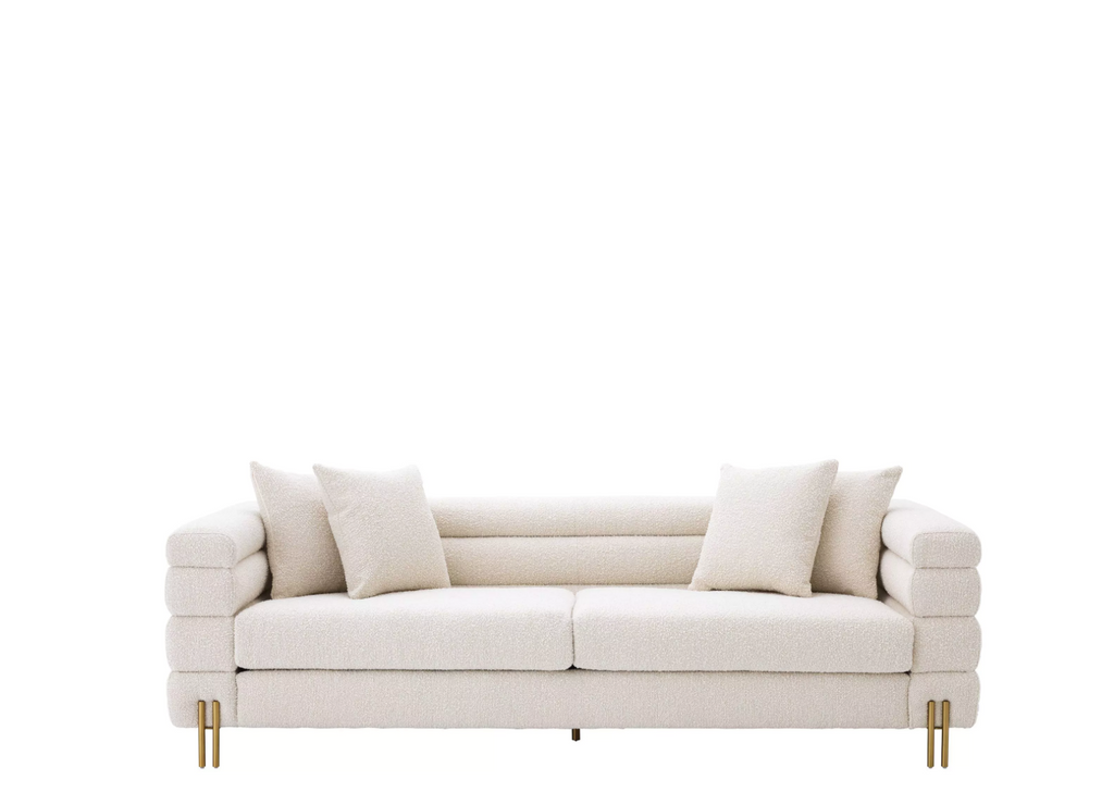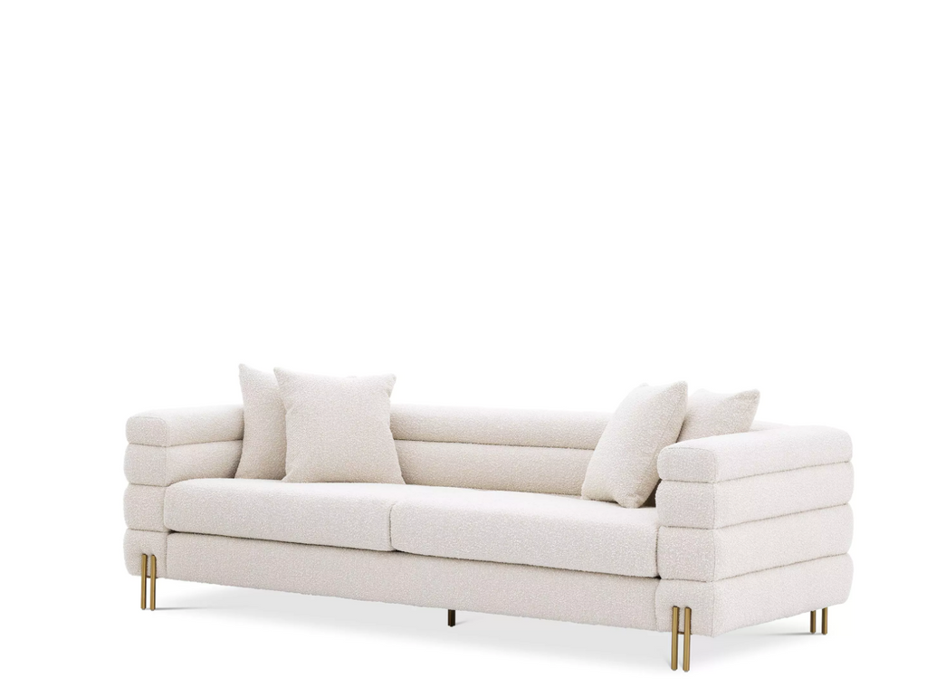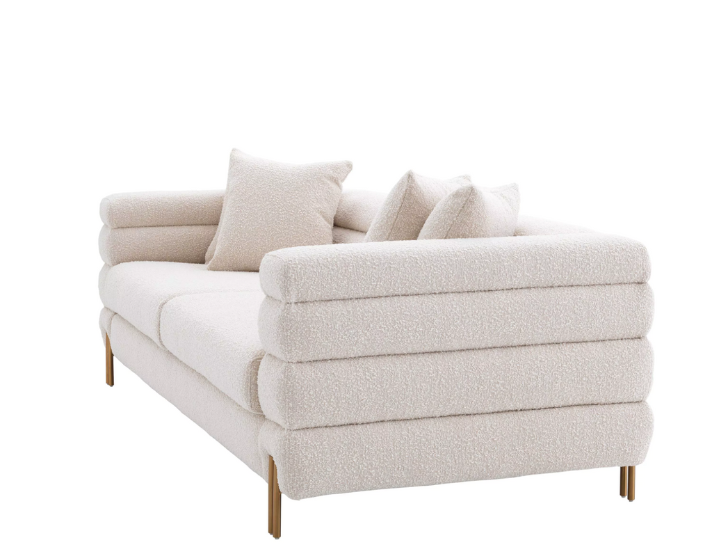 Caratteristiche: Il favoloso divano York crema bouclé con gambe in ottone spazzolato. La sua silhouette distintiva è ispirata a Streamline Moderne, uno stile di design Art Déco internazionale degli anni '30 caratterizzato da morbide forme curve e lunghe linee orizzontali. Viene fornito con 4 cuscini quadrati.