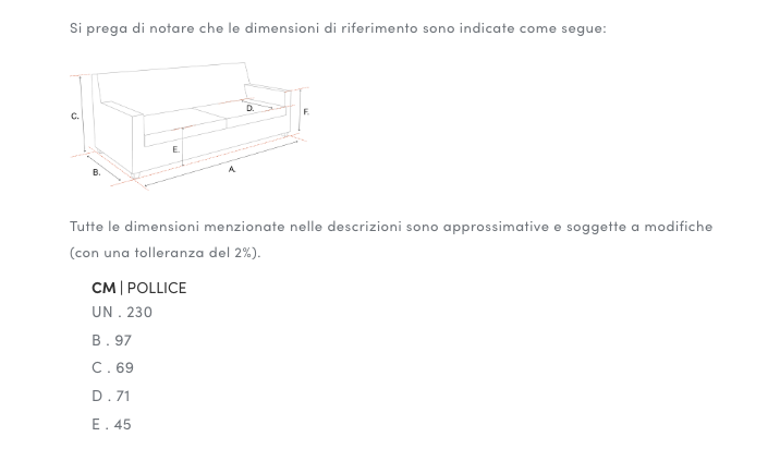 Dimensioni: A. 230 | B. 97 | C. 69 | D. 71 | E. 45 cm (vedi foto)